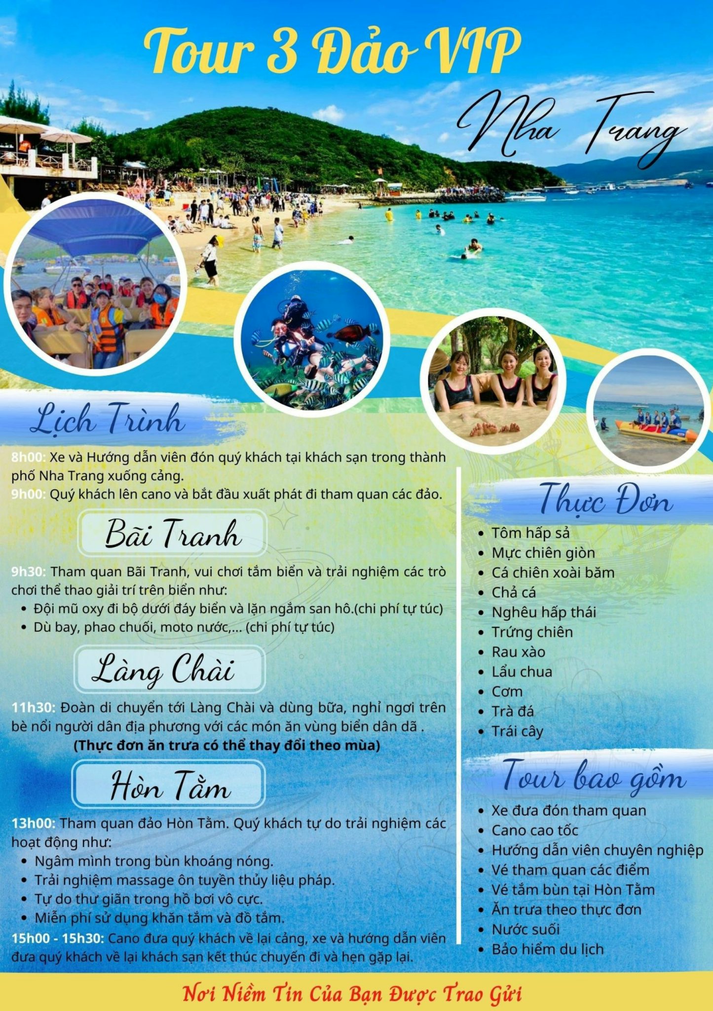 Tour 3 Đảo VIP là một trong những hành trình được yêu thích nhất tại Nha Trang, mang đến trải nghiệm biển đảo đẳng cấp với lịch trình tinh gọn, thoải mái và phù hợp cho cả gia đình, nhóm bạn hoặc du khách muốn tận hưởng một ngày nghỉ dưỡng trọn vẹn. Mỗi điểm đến trong tour đều được chọn lọc để đem lại sự kết hợp hài hòa giữa vui chơi – khám phá – thư giãn